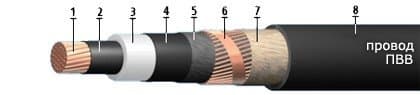 экран, защищающий от электромагнитных помех – из специального композиционного вещества с оболочкой из фольги. Экранирующее покрытие располагается металлической частью внутрь. Под экраном прокладывается пара меднолуженых контактных проволок номинального диаметра 0,32 – 0,5 мм.Внутренний защитный слой - из поливинилхлоридного полимерного пластиката
